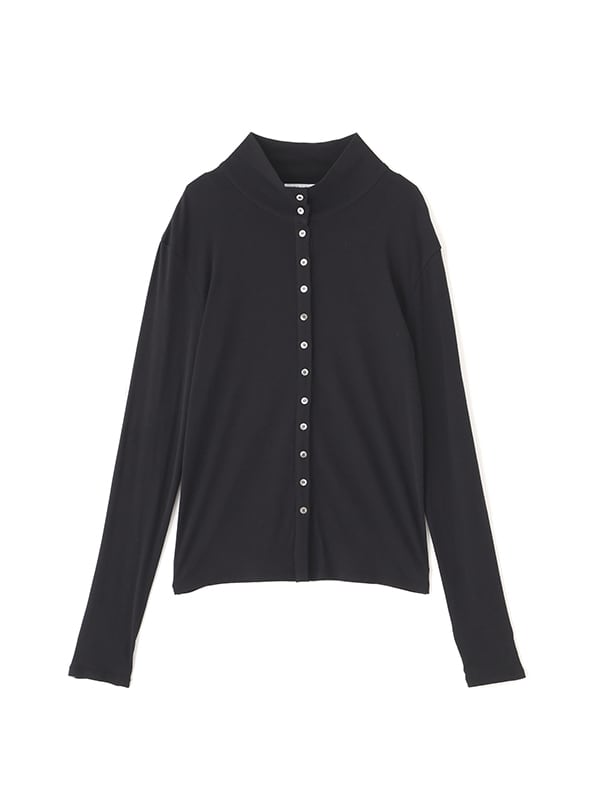 ハイネックのフロントオープンデザインが印象的なカットソープルオーバーは、途中までフロントボタンを開け、衿を倒して抜け感を出す着こなしがおすすめ。